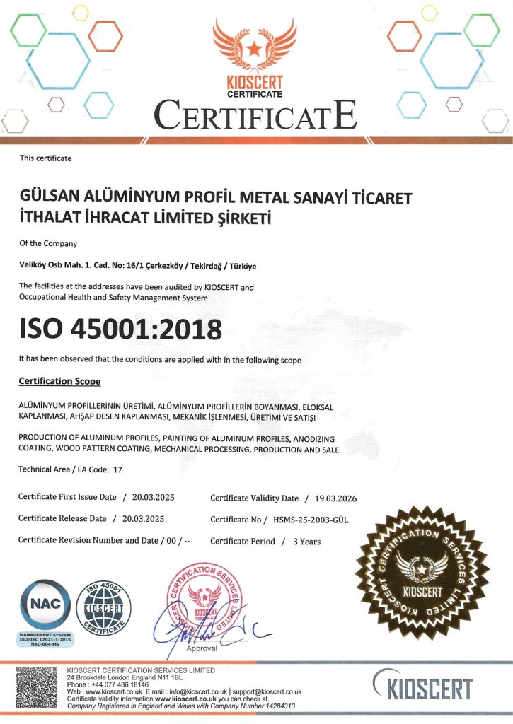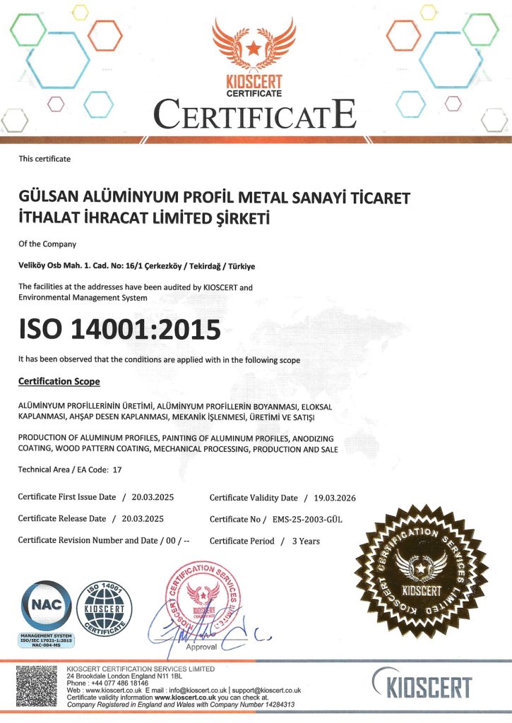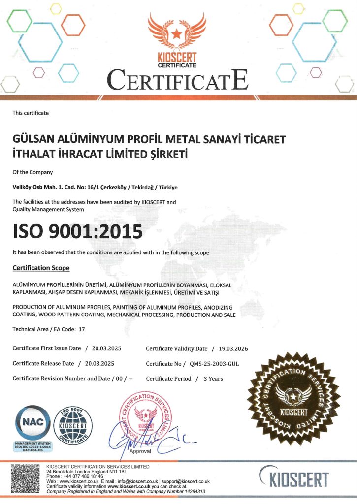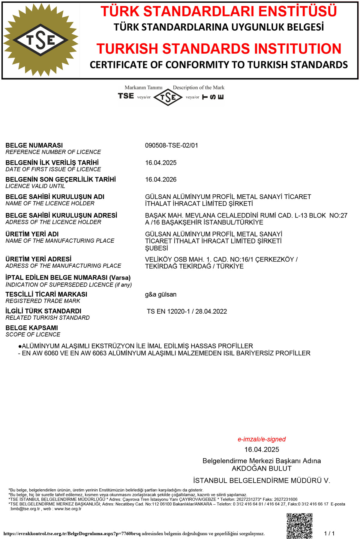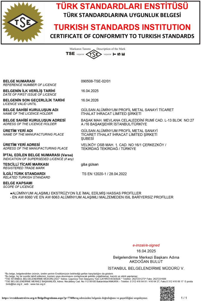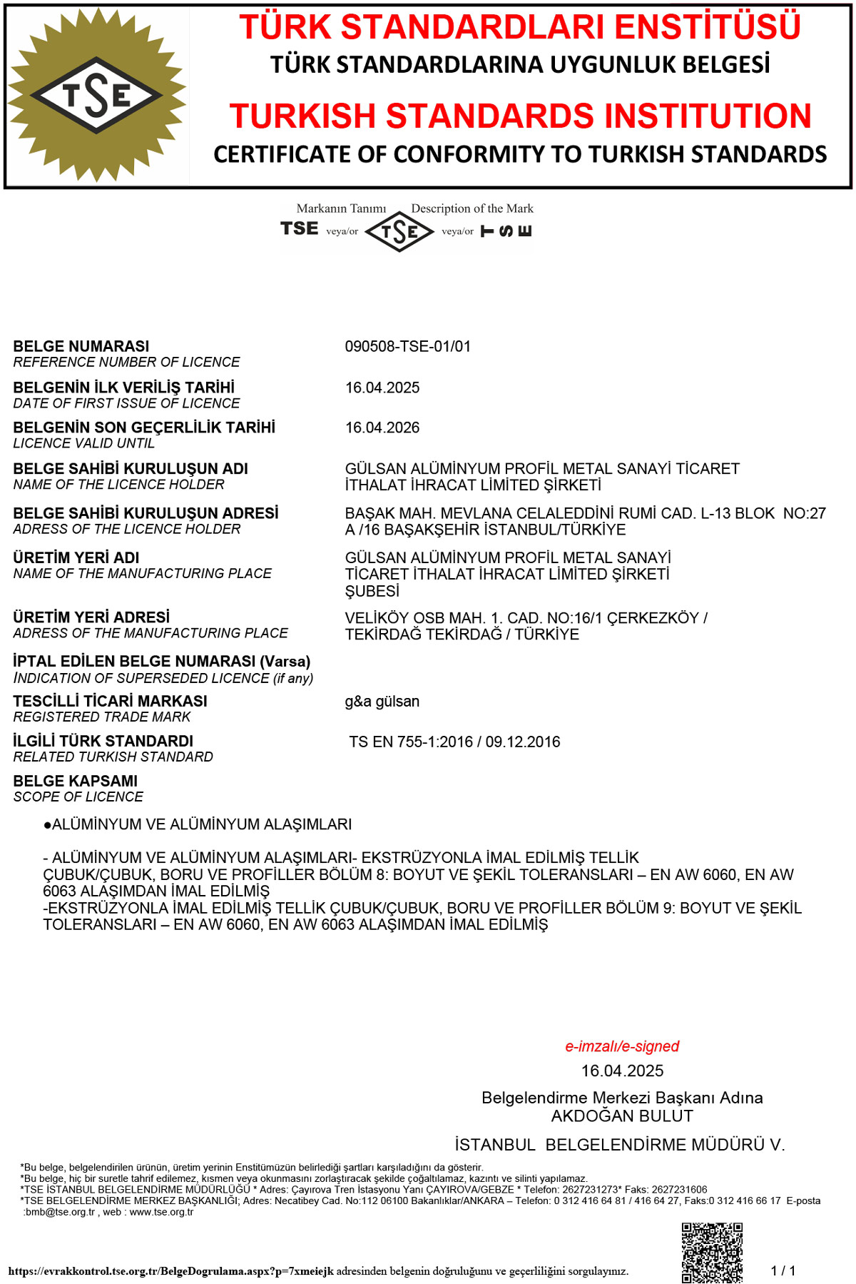 As a global manufacturer, our product quality is guaranteed by internationally valid documents. Quality control and product quality are standardized with EN 15088:2005 Factory Production Control (CE) certificate, TS EN 755-9, TS EN 755-1, TS EN 12020-1 and TS 4922 TSE conformity certificates, QUALICOAT certificates.</p >